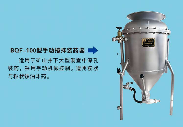 BQF-100型抬杠式有攪拌裝藥器,適用于礦山井下大型洞室中深孔裝藥,采用手動機(jī)械控制。適用粉狀與粒狀銨* 油* 炸* 藥。